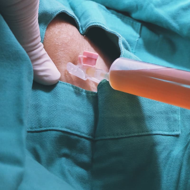 Лечение серомы в амбулаторных условиях. Хирург производит аспирацию серозной жидкости с помощью шприца, предварительно обеззаразив место введения иглы