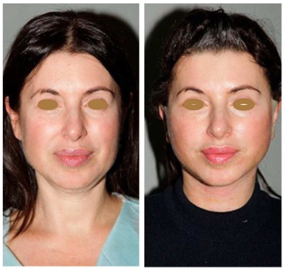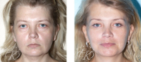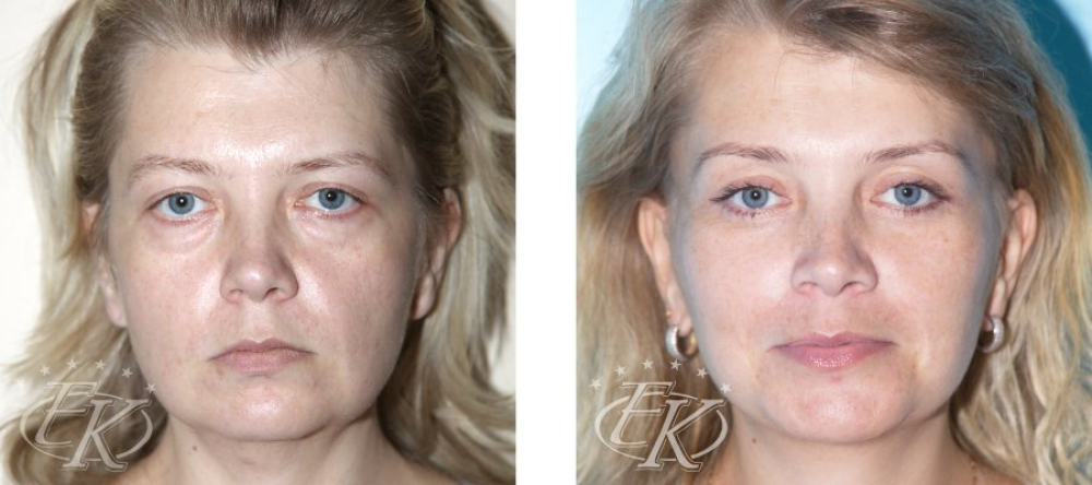 До: расплывчатый овал, птоз средней зоны лица, тяжёлые веки, тёмные круги, сеть морщин вокруг глаз, мягкий, «растворённый» подбородок.