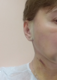 Дык, собственно больших ран не было, всего лишь небольшие заушные разрезики длиной не более 4-х см. Отечность присутствовала в области щек и шеи, но без ярко выраженной синюшности и продержалась около пяти дней после спейслифтинга. А через десять дней после операции доктор Баландин разрешил мне выйти на работу.