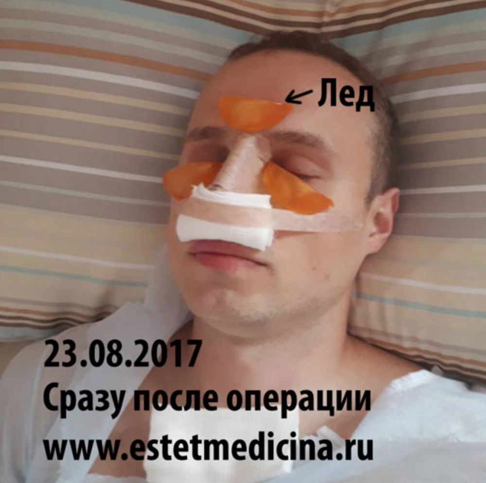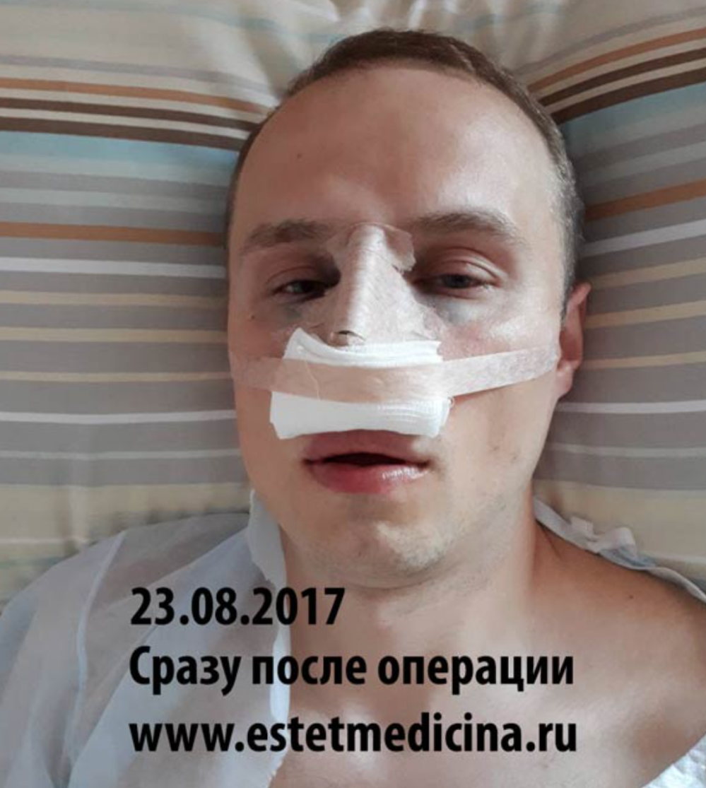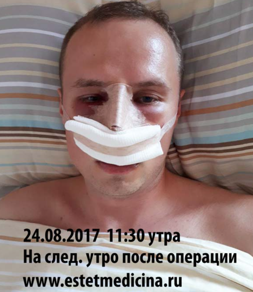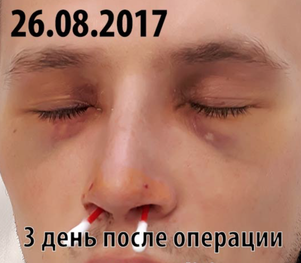 На тот момент находился дома, отек был еще больше, правда доктор меня предупреждал, что на то время - это будет пик отека. В носу у меня турунды, такие плотные тампоны, поэтому дышу я только ртом. Чувствовал себя так себе.На следующий день в клинике — обещали снять турунды и поменять шину. Позже напишу подробно что было.