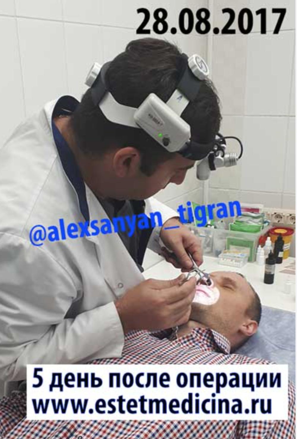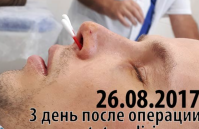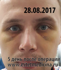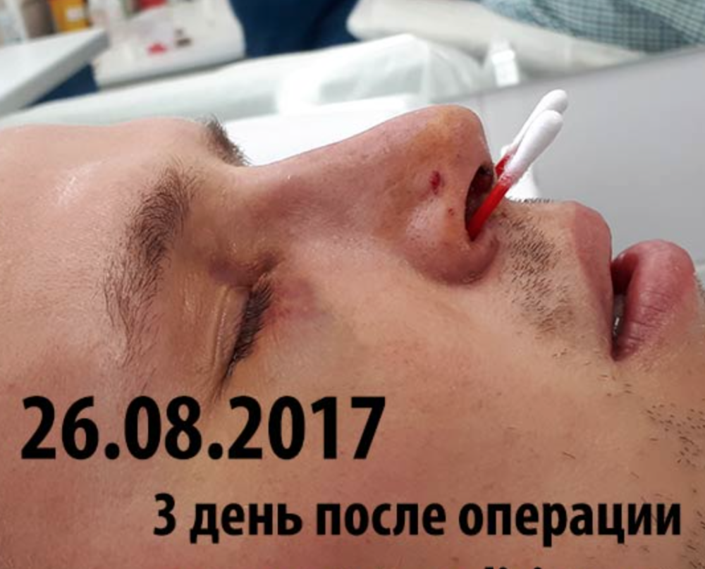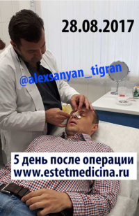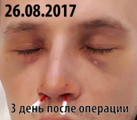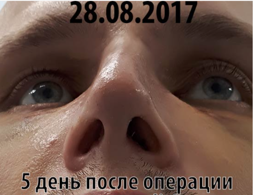 Рассказываю про 5 день после операции! Начал чувствовать себя гораздо лучше, прям ожил Хотел бы отметить еще кое-какие моменты, которые упустил при первом рассказе. — Самый большой отек был на первый день после операции, именно этот день был самым «не веселым», я почти не спал, была температура около 37, болела голова…. — На следующий день, то есть это 2 день после операции, вынули турунды из носа и сразу, подчеркну СРАЗУ стало легче и отек начал спадать. Все последующие дни — отек становился все меньше и меньше. Турунды — это такие длинные тампоны пропитанные мазью Левомеколь. Нужны они для фиксации внутреннего носа после операции, как мне сказали. Шина сверху, а в ноздри — турунды. Они оказались такие длинные, что вообще непонятно как они поместились в носу))) Вытаскивали их минут пять от силы с перерывами, ощущения были болезненные и неприятные, скорее даже неприятные. Здесь главное не зажимать ноздри, не напрягаться, так как тогда еще больнее. После снятия турунд — нос сразу задышал, обеими ноздрями, такого давно не испытывал, ведь у меня был довольно сильно сломан нос, одна ноздря плохо дышала и был почти хронический насморк. Но не надолго, так как шина давит на нос сверху, сжимает ноздри, проходы сужаются, и сопли и кровянистые выделения быстро заполнили ноздри. Так что я уверенно хлюпал носом через 10-20 минут после снятия турунд. Наверное, вынимание турунд и первый день после операции — это самое неприятное из всего процесса. Идем далее. Получил рекомендации чистить нос перекисью водорода 3%. Ушную палочку смачиваешь в Перекиси и аккуратно прочищаешь ноздри внутри. Делать доктор Тигран сказал это часто, важно, чтобы нос был чистый, иначе доктор сказал могут образоваться спайки. Также сделал магнитную и ультразвуковую терапию на синяки под глазами, это реабилитация, которую делают все пациенты доктора Тиграна Альбертовича в его клинике. И на следующий день синяки сразу пожелтели, это хороший знак! 3 день после операции 26.08.2017 Спал уже хорошо — это первый день когда я за ночь не просыпался, спал глубоким сном. Температура 36.6 Снова совершил визит в клинику, доктор Тигран снова поменял шину, почистил нос внутри. В этот день я в первый раз увидел свой нос после операции — ровный))))) После установки новой шины, уже не так все весело, так как ноздри сжимаются и наличие небольшого количества соплей хватает чтобы закрыть проход для воздуха. Снова делал магнитную и ультразвуковую терапию; Вообще, хочу выделить это отдельно. Когда Вы сделали ринопластику у Тиграна Альбертовича — первые дни после операции Вы каждый день приезжаете в клинику на осмотры: замена шины, туалет раны, магнитная и ультразвуковая терапия, начиная где-то с 5го дня, посещения стали назначать через день. Это особенный подход, который мне, как пациенту, конечно нравится. Ведь в других клиниках (а я знаю не понаслышке), ставят гипс, вынимают турунды на след. день после операции и все — следующий визит через 10 дней. И что получится, то получится! Отек под гипсом спадает на 4-5 день и гипс уже не выполняет свою функцию, нос заживает как заживет… Тигран Алексанян в этом плане очень ответственный доктор, поэтому у него много операций и много положительных отзывов не только в сети, но и в реальной жизни. Ну и фотоотчет во вложении!