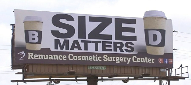 На рекламном щите изображены две чашки кофе. Та, что поменьше, обозначена буквой «B», чашка побольше — «D» (в аналогии с размерами чашек бюстгальтеров). Изображение сопровождается слоганом «Размер имеет значение».