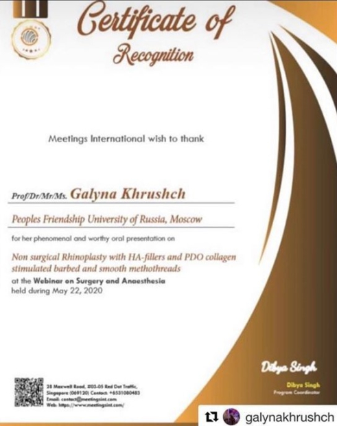 Её презентация «Non surgical rhinoplasty with HA-fillers and HDO collagen stimulated barben and smooth methothreads» впечатлила косметологов и хирургов. Признание коллег отметили и организаторы конференции, наградив доктора Хрущ почетным сертификатом.