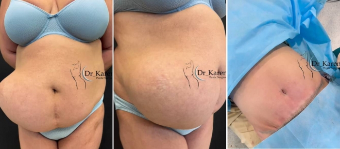 Пациентка обратилась к пластическому хирургу Карену Пайтяну с просьбой устранить послеоперационную грыжу (полостная операция была выполнена другим хирургом в другой клинике). Диаметр грыжи — 20-25 см. Доктор Пайтян удалил грыжу и выполнил эстетическую абдоминопластику. Результат на операционном столе